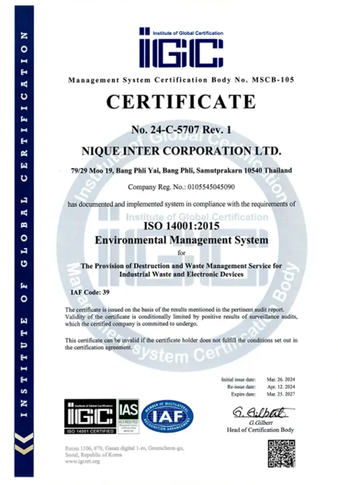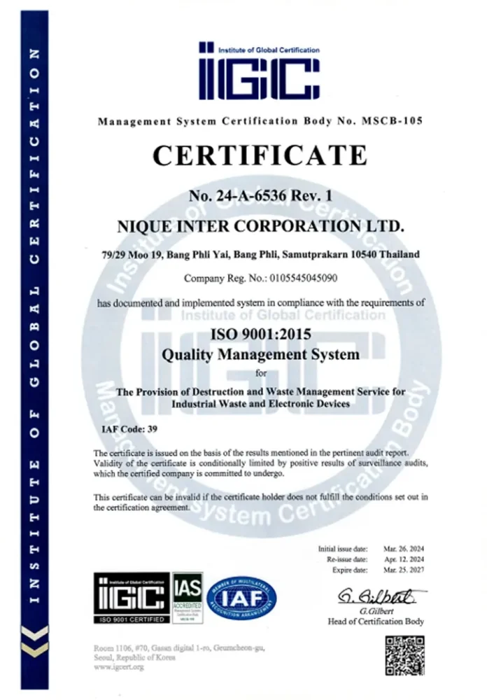 - ดำเนินงานภายใต้มาตรฐานระดับสากล ได้แก่ ISO 9001 (คุณภาพ), ISO 14001 (สิ่งแวดล้อม), และ ISO 27001 (การรักษาความลับของลูกค้า) เพื่อเสริมสร้างความน่าเชื่อถือและความปลอดภัยให้กับทุกกระบวนการ